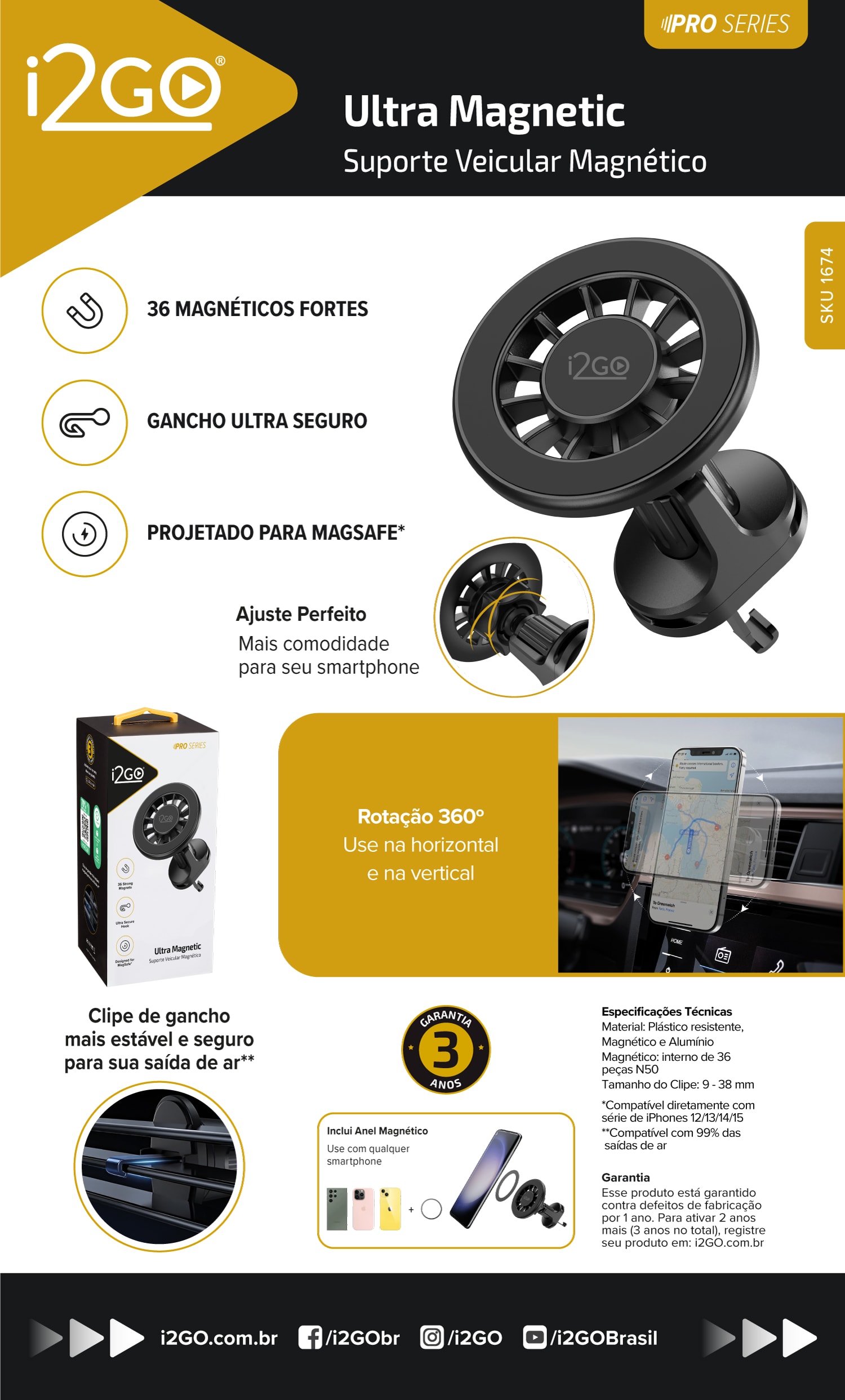 Compatível com a tecnologia MagSafe, o i2GO Ultra Magnetic foi criado sob medida para oferecer um encaixe rápido e seguro. Além disso, ele vem com um anel magnético, tornando-o compatível com qualquer smartphone, independentemente da marca ou modelo. Com rotação de 360 graus, você pode ajustar o suporte para usar o celular na horizontal ou vertical, facilitando a visualização de mapas, mensagens ou qualquer outra função. E tudo isso em um design compacto e discreto que não obstrui a visão do motorista, oferecendo um ajuste perfeito no seu carro.36 Magnetos Potentes: Com 36 ímãs poderosos, o i2GO Ultra Magnetic suporta dispositivos de até 1,5 kg, garantindo que seu smartphone permaneça seguro e estável, mesmo em estradas irregulares.